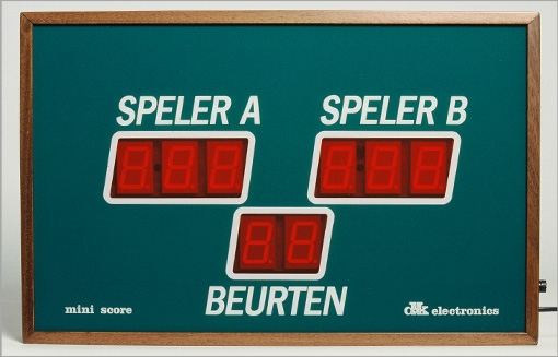 • Dit eenvoudige scorebord is voorzien van twee tellers met drie cijfers om de speelstand weer te geven en een teller om het aantal beurten aan te geven